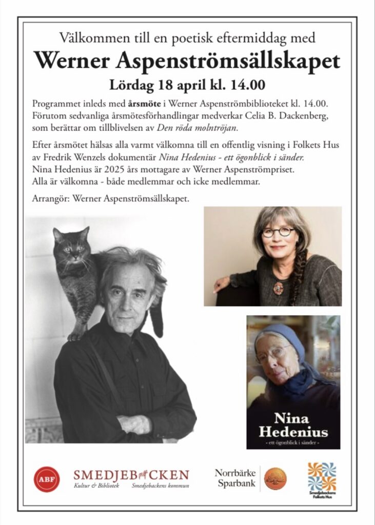 Årsmötet i Werner Aspenströmsällskapet hålls lördag den 18 april kl. 14.00 på Werner Aspenströmbiblioteket i Smedjebacken.